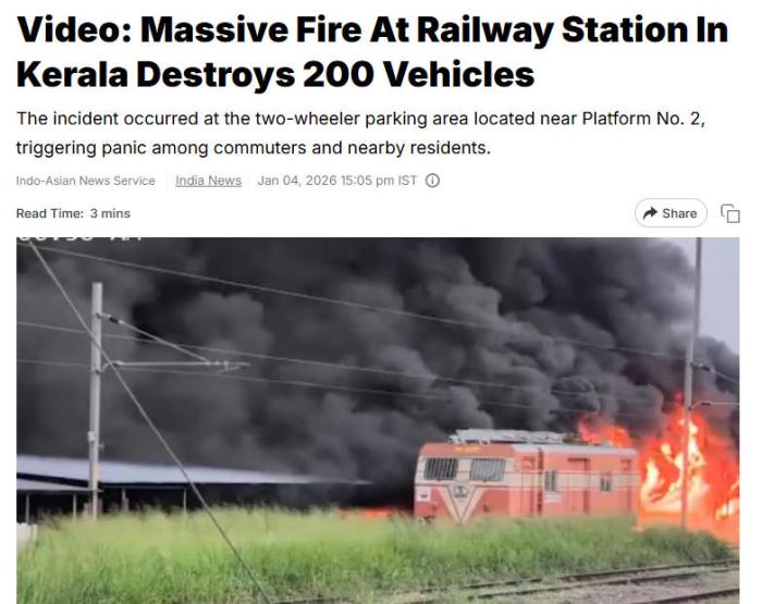 1月6日电 据印度新德里电望台(NDTV)报导,当前,印度特里苏我水车站(Thrissur)发作庞大火警,致使车站四周泊车场的多辆车辆遭销毁。图片根源:印度新德里电瞅台(NDTV)报导截图  据报导,凭据始步讲述,火警最早于4日早晨6时45分摆布被创造,并疾速舒展至四周泊车场,激励通勤者战四周住户的慌张。  消防支持职员交报后当即前往现场,并出动多辆消防车。水势终究获得操纵。  目睹者称,没有少车辆被全数销毁,尚有多辆车片面授益。今朝,政府仍正在评价被誉车辆确实切数目。据悉,该泊车场日常天天可包容数百辆摩托车等车辆。  报导称,火警缘故还没有判断。